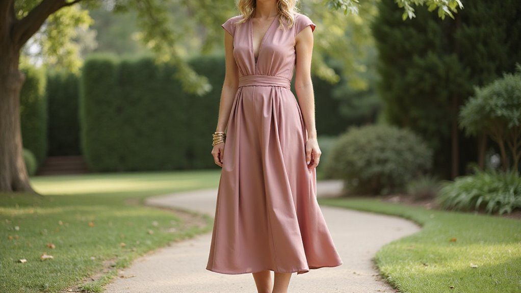 Avoid stiletto heels on grass or gravel surfaces. Choose deeper colors like burgundy, forest green, or navy for autumn celebrations. Simple accessories complete the look without appearing overdressed.