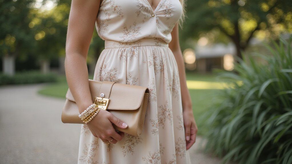 Focus on balancing statement jewelry with your dress’s neckline, choosing a clutch that’s both functional and elegant, and picking footwear that accommodates the venue’s terrain—whether you’re traversing Louisville’s historic church floors or a rustic barn setting. Don’t overlook hair accessories and headwear, which can improve your style while respecting any religious or venue-specific protocols.